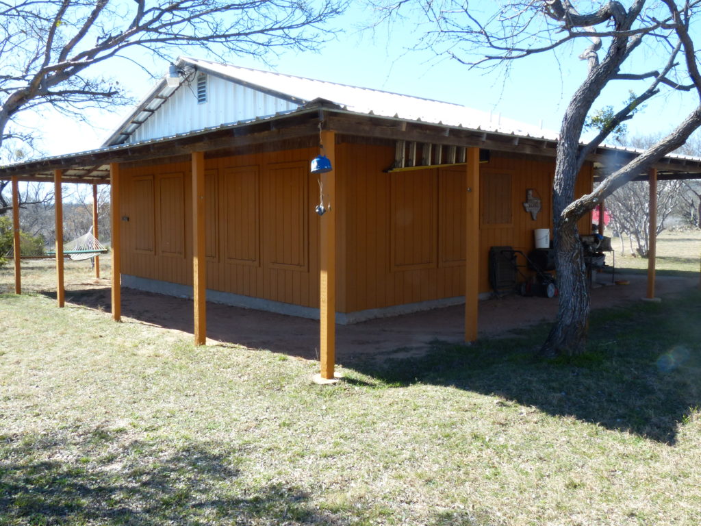 Behind the home is a quaint frame cabin.  It is a 26 x 24 building with a concrete foundation. All the oversized covered windows open up to make a great breezy place for entertaining and living. It has a wood-burning stove and a kitchenette with a gas range and refrigerator.  With the 3/4 bathroom, it is just right for friends or grand-kids.